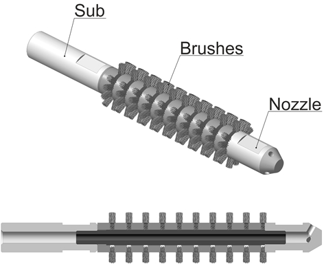 The brush consists of a set of interchangeable brushes and subs for connection. For running on coiled tubing and with mud motor, it has watercourse for circulation and tool joint thread.